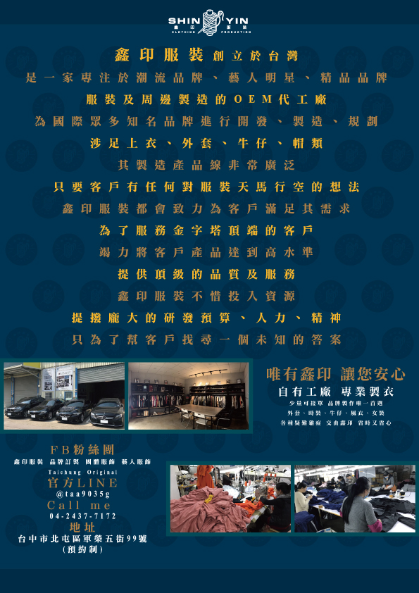 服飾設計  團體服  公司制服  戲服  系服  公司  校服 公司服 鑫印服裝  班服  炫彩  印刷  台中團服製作 台中班服製作  新北團服製作 新北班服製作 台北團服製作 台北班服製作  桃園團服製作 桃園班服製作 苗栗團服製作 苗栗班服製作 台南團服製作  台南班服製作  高雄團服製作 高雄班服製作 新竹團服製作 新竹班服製作 彰化團服製作 彰化班服製作  屏東團服製作 屏東班服製作  雲林團服製作 雲林班服製作 嘉義團服製作 嘉義班服製作 宜蘭團服製作 宜蘭班服製作 花蓮團服製作 花蓮班服製作 澎湖團服製作 澎湖班服製作 金門團服製作 金門班服製作 南投團服製作 南投班服製作 台中品牌製作 台北品牌製作 新北品牌製作 桃園品牌製作 苗栗品牌製作 台南品牌製作 高雄品牌製作 新竹品牌製作 彰化品牌製作 雲林品牌製作 彰化品牌製作 屏東品牌製作  #鑫印服裝 #自創品牌 #客製化 #精梳棉 #MIT #代工 #工廠 #刺繡 #印刷 #水洗 #寬版 #衣版 #打版 #時裝 #帽子 #外套 #藝人周邊 #包包 #公司制服 #工裝 #牛仔褲 #洋裝 #瑜珈服 #成衣廠 #POLO衫 #TEE #班服 #西裝外套 #團體服